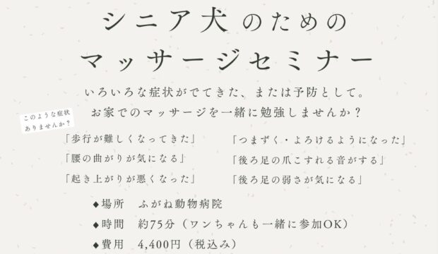 マッサージセミナー第2回 シニア犬のためのマッサージセミナー 2025.05.28 スザキエリさんを講師に迎えて、シニア犬のためのマッサージセミナーを行いました。マッサージ犬 2025年4月の鍼治療前の記事 5月の鍼治療次の記事